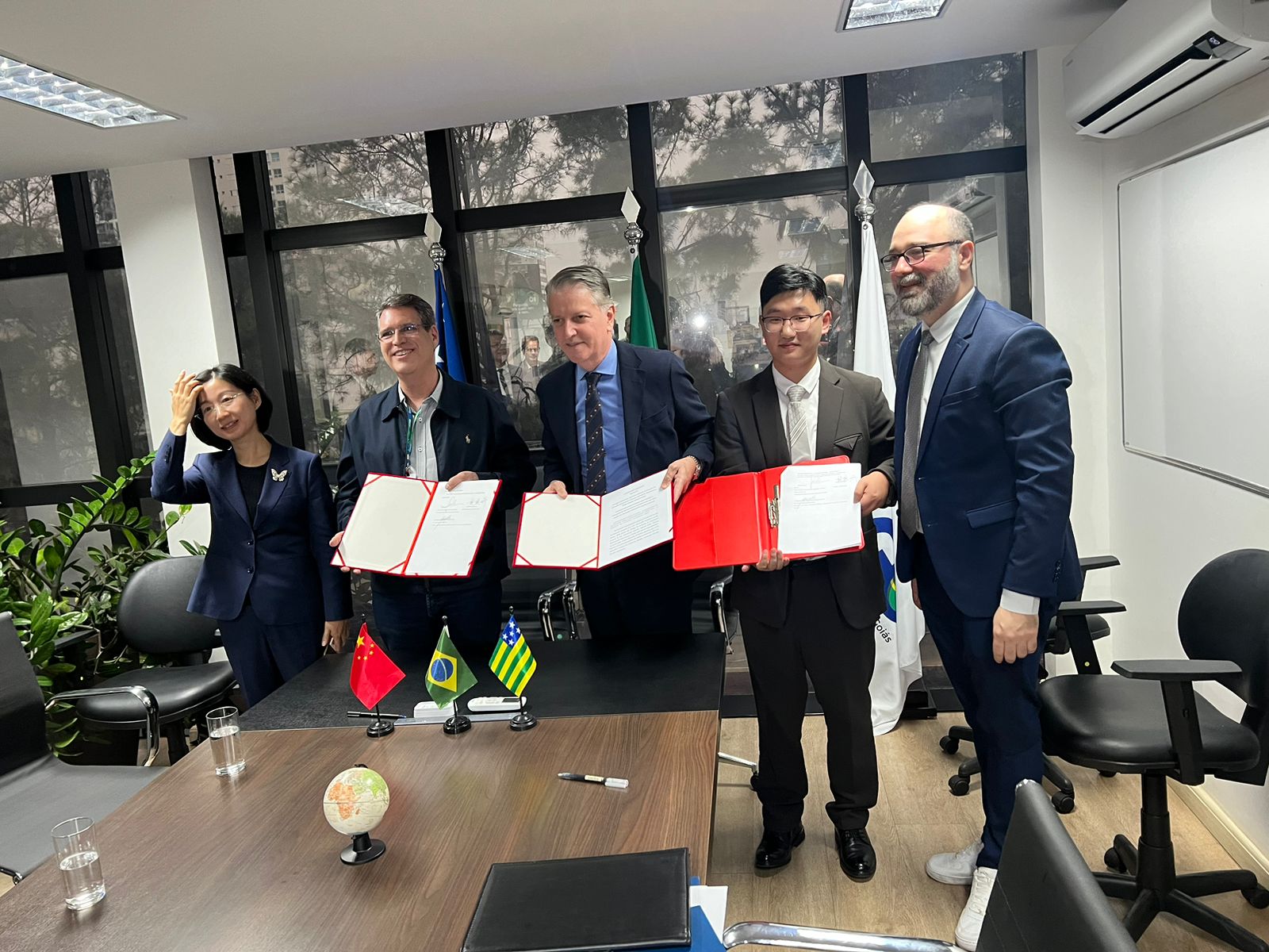 O presidente da Companhia de Desenvolvimento Econômico (Codego) Francisco Júnior assinou, na tarde de segunda-feira, 26, um acordo de cooperação com a empresa chinesa Taitong International Transport para a criação de um parque industrial de logística comercial em Goiás. A empresa atua no setor de logística ferroviária, rodoviária, aérea e marítima e está presente em 37 países. O secretário de Indústria e Comércio, Joel Sant’Anna, e o chefe de Gabinete de Assuntos Internacionais,Giordano Sarvio, também assinaram o documento.
