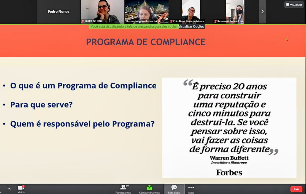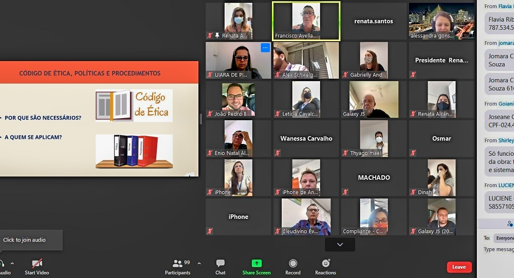 Por videoconferência, 100 colaboradores da sede da Companhia de Desenvolvimento Econômico de Goiás (Codego) e dos distritos agroindustriais administrados pela empresa pública participaram nesta quarta-feira (28/4) da palestra sobre ética e compliance, conduzida pela advogada e sócia-fundadora da Lec e do Gonsales e Cho Advogados Associados, Alessandra Gonsales. Os participantes receberão um certificado, que será emitido pela Direção da Codego.
